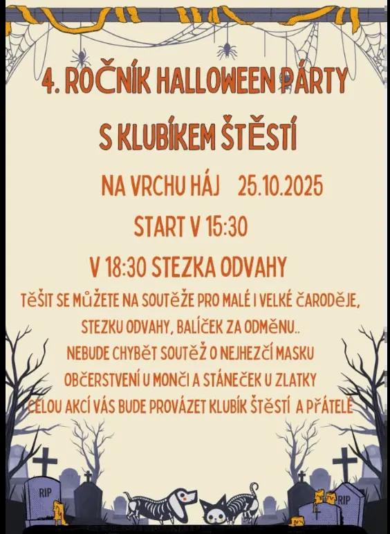 Klubík Štěstí vás srdečně zve na 4. ročník Halloween Party, která se uskuteční v sobotu 25. října 2025 na vrchu Háj. Akce začíná v 15:30 hodin, a v 18:30 se můžete těšit na oblíbenou Stezku odvahy.