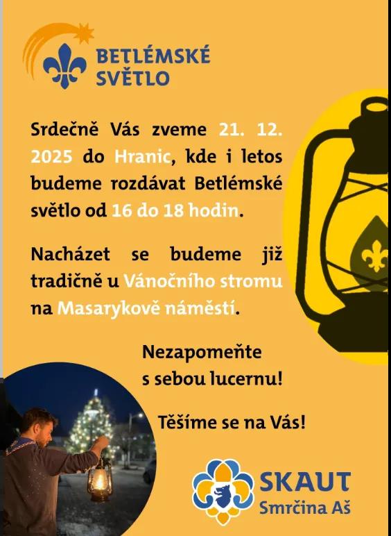 Srdečně Vás zveme 21. prosince 2025 do Aše, kde i letos budeme od 15 do 19 hodin rozdávat Betlémské světlo. Tradičně nás najdete na Poštovním náměstí v rámi Skřítkových Ašských Vánoc.