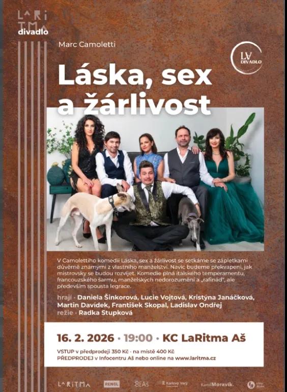 V Camolettiho komedii Láska, sex a žárlivost se setkáme se zápletkami důvěrně známými z vlastního manželství. Navíc budeme překvapeni, jak mistrovsky se budou rozvíjet. Komedie plná italského temperamentu, francouzského šarmu, manželských nedorozumění a „rafinád“, ale především spousta legrace.