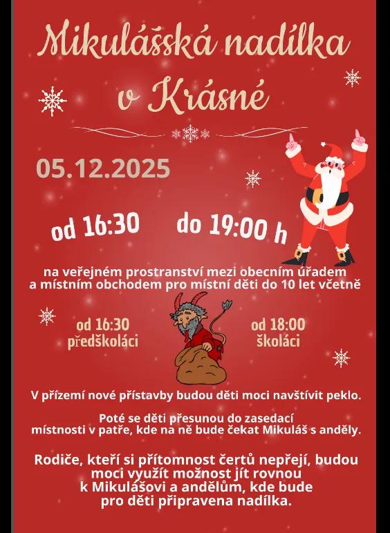Obec Krásná zve všechny místní děti do 10 let včetně na tradiční Mikulášskou nadílku, která se uskuteční 5. prosince 2025 od 16:30 do 19:00 hodin. Akce proběhne na veřejném prostranství mezi obecním úřadem a místním obchodem.