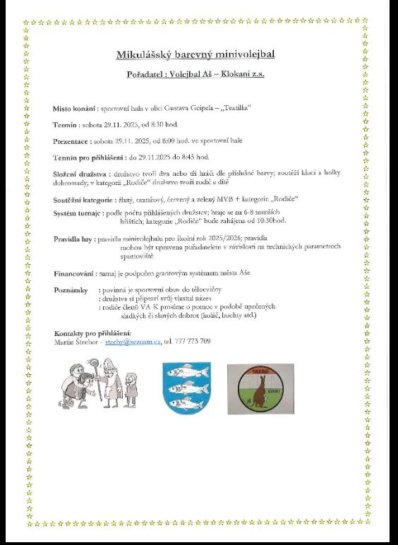 Volejbal Aš – Klokani z. s. pořádá Mikulášský barevný minivolejbal, který se uskuteční v sobotu 29. 11. 2025 ve sportovní hale v ulici Gustava Geipela – Textilka. Turnaj začne v 8:30, prezentace proběhne na místě od 8:00. Přihlášky je možné podávat až do 8:45 téhož dne.