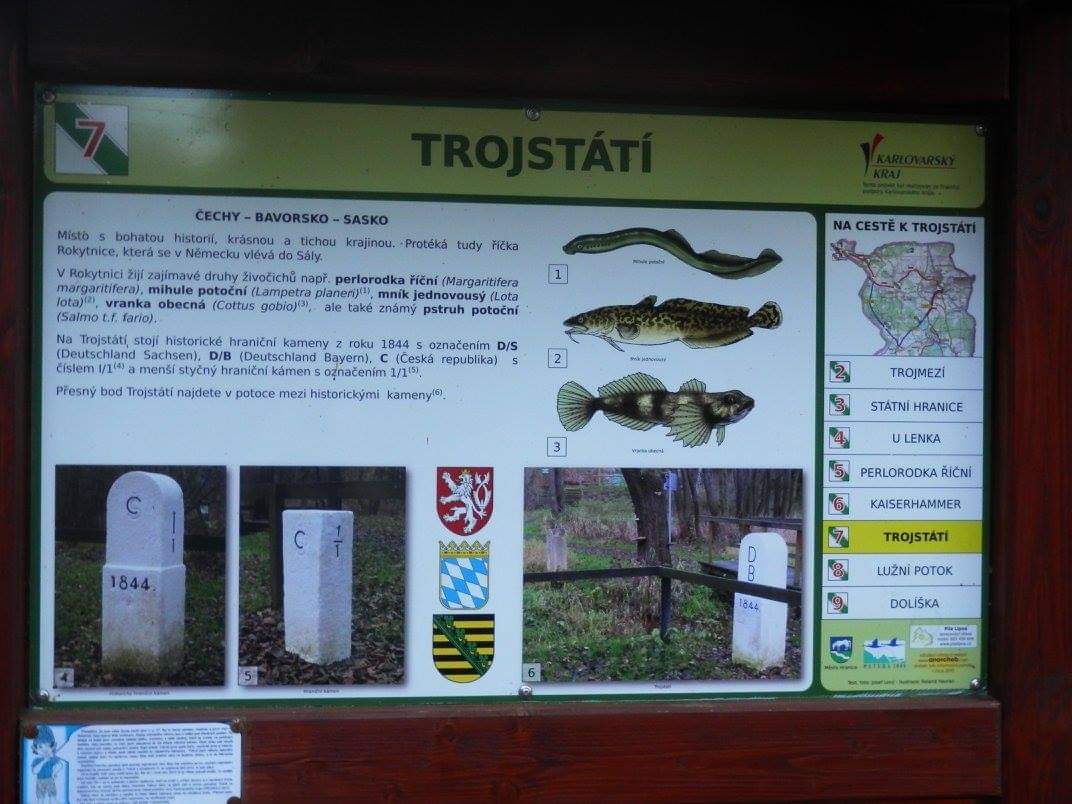 Trojstátí: Samotný bod Trojstátí není označen, protože leží v potoce mezi historickými hraničními kameny z roku 1844, označenými DB (Deutschland Bayern), DS (Deutschland Sachsen) a C (Česká republika). Toto místo je významným symbolem spojení a historického dělení.